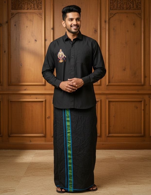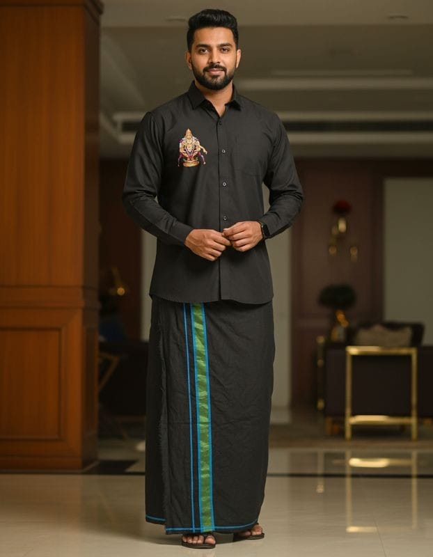 Key features of an Ayyappa print black shirt