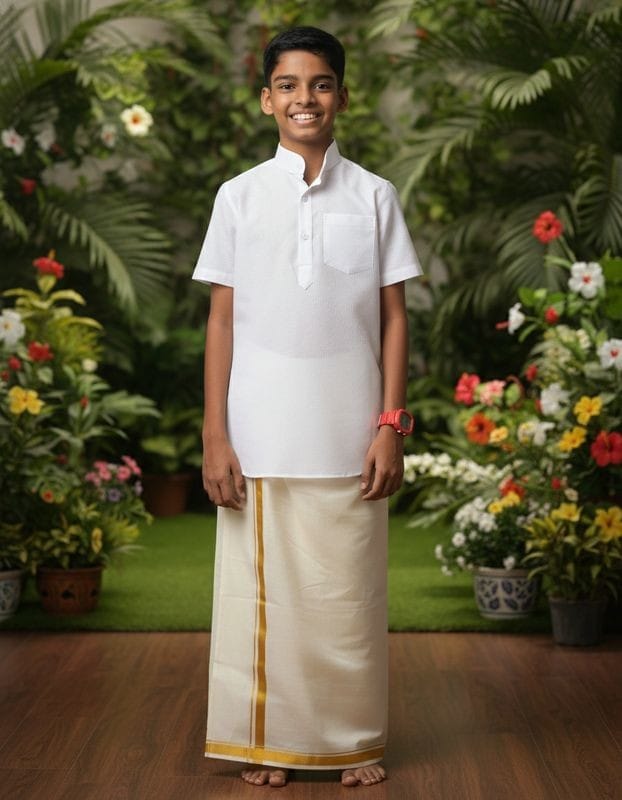 A boy's white kurta and mundu set typically includes a loose, straight-cut white kurta shirt and a white draped bottom, often a mundu, veshti, or lungi. The kurta has a neckline like a mandarin collar and can feature short or long sleeves, while the mundu is a simple, traditional dhoti-like garment that wraps around the waist. The set is often made of cotton or silk blends for comfort and is a traditional yet modern outfit, suitable for formal occasions.