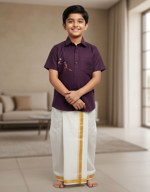 A boy's Wine Red Shirt and mundu set typically includes a loose, straight-cut Wine Red Shirt and a white draped bottom, often a mundu, veshti, or lungi. The shirt has a neckline like a mandarin collar and can feature short or long sleeves, while the mundu is a simple, traditional dhoti-like garment that wraps around the waist. The set is often made of cotton or silk blends for comfort and is a traditional yet modern outfit, suitable for formal occasions.