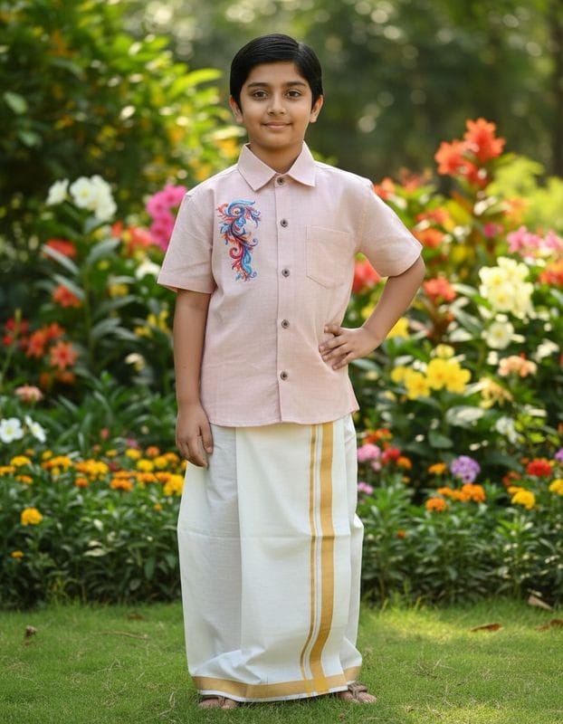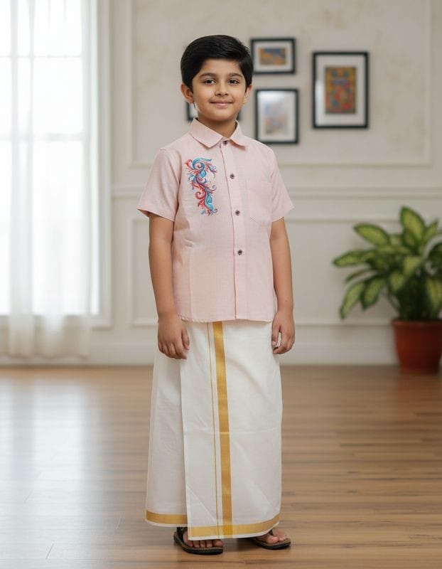 A boy's Copper Colour Shirt and mundu set typically includes a loose, straight-cut Copper colour shirt and a white draped bottom, often a mundu, veshti, or lungi. The shirt has a neckline like a mandarin collar and can feature short or long sleeves, while the mundu is a simple, traditional dhoti-like garment that wraps around the waist. The set is often made of cotton or silk blends for comfort and is a traditional yet modern outfit, suitable for formal occasions.
