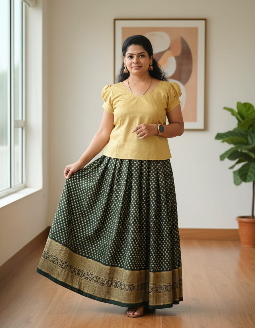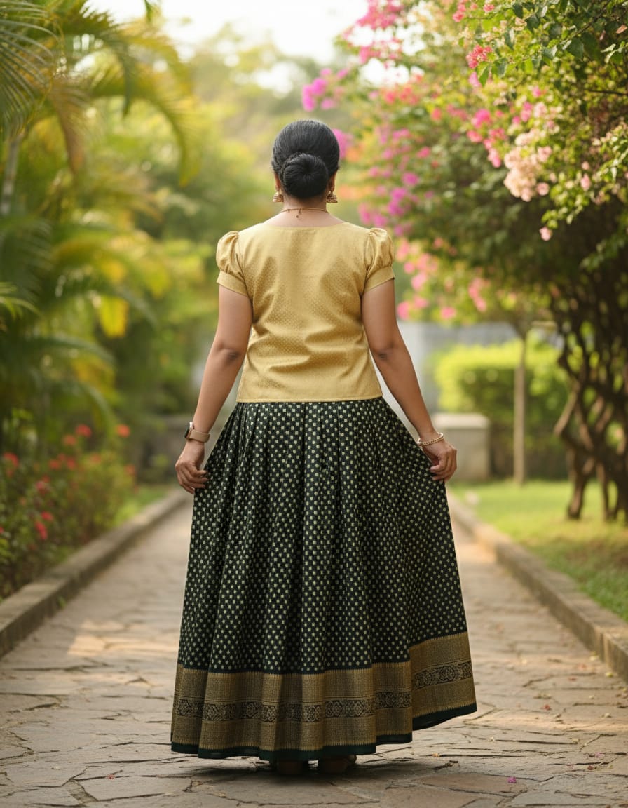 A traditional fancy pattu pavadai is a two-piece silk outfit consisting of a long, pleated skirt (pavadai) and a blouse (cholicholi, 𝑐ℎ𝑜𝑙𝑖), worn for special ccasions. It is known for its rich silk fabric, often embellished with intricate gold zari work featuring traditional motifs like peacocks, temple borders, or floral vines. The dress is typically characterized by vibrant jewel tones, elaborate borders, and is a symbol of heritage and grace in South Indian culture.