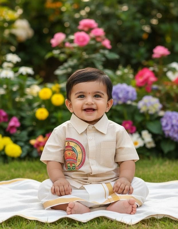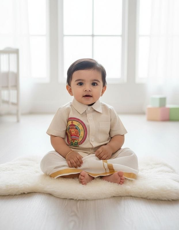 A kids boy's cream shirt and mundu set typically includes a loose, straight-cut cream shirt and a white draped bottom, often a mundu, veshti, or lungi. The shirt has a neckline like a mandarin collar and can feature short or long sleeves, while the mundu is a simple, traditional dhoti-like garment that wraps around the waist. The set is often made of cotton or silk blends for comfort and is a traditional yet modern outfit, suitable for formal occasions.