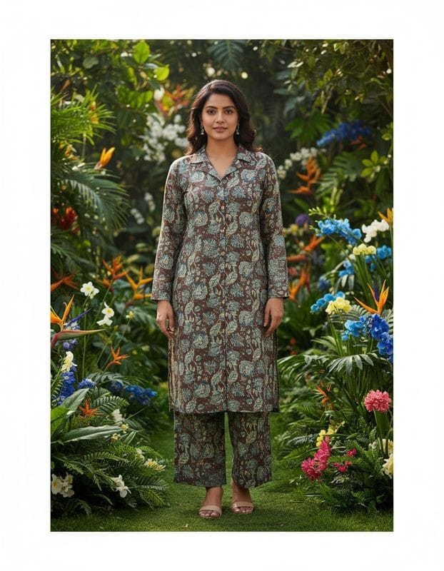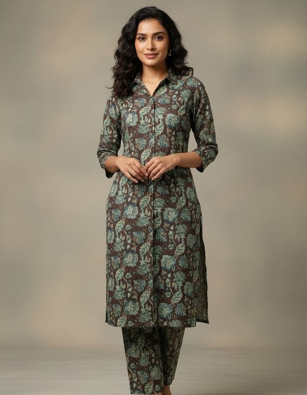 Ajarak Cotton Print Coordset Light Coffee Collar Neck