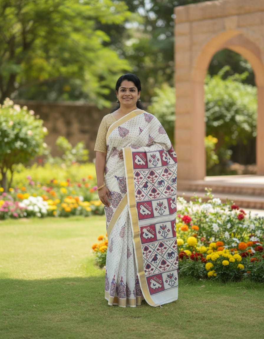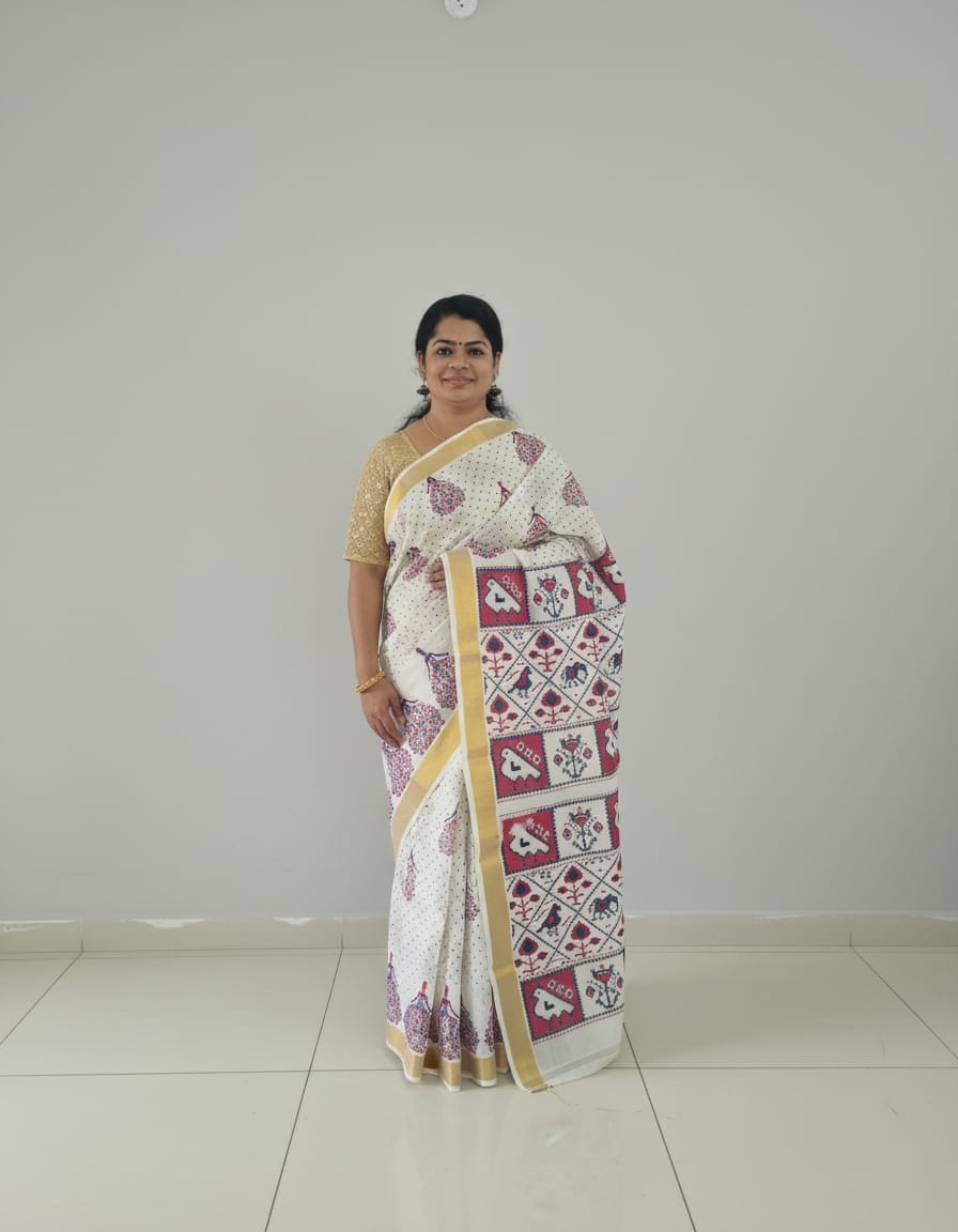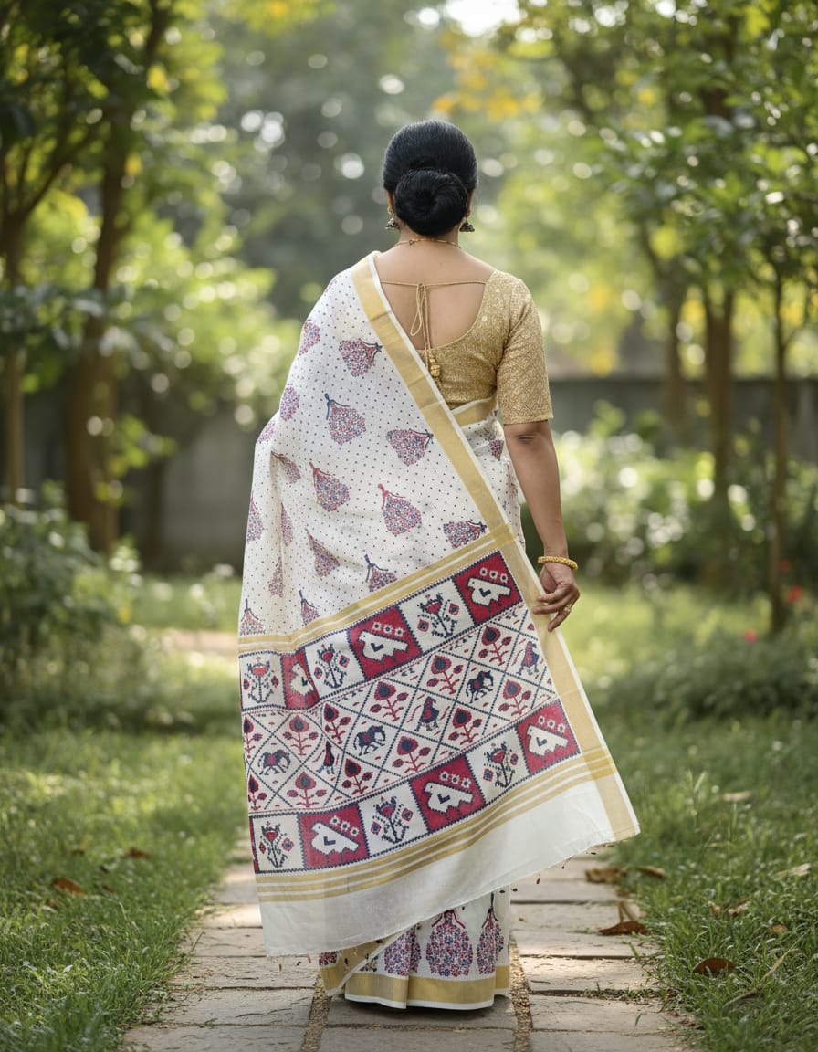 Kerala traditional printed sarees, evolving from the iconic off-white Kasavu (gold-bordered) style, feature breathable cotton/silk bases with vibrant, cultural prints like temple motifs, nature scenes, or geometric patterns (Warli, checks) on the borders, blending timeless grace with modern artistry for festive wear, offering comfort and distinct elegance for various occasions.
