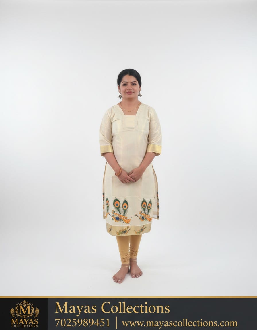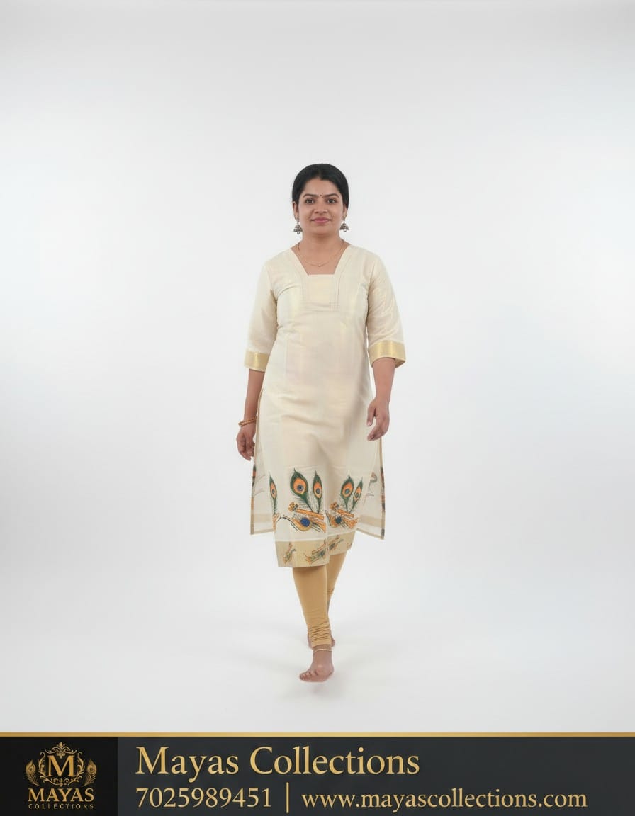 A Kerala traditional kurti is typically a long, loose top made from Kerala tissue fabric, often with a soft sheen and a golden, off-white, or other rich color base. It is frequently adorned with intricate handwork, embroidery, or woven golden designs inspired by traditional Kerala art. Key features often include a round neckline, three-quarter sleeves, and a slitted or straight-cut silhouette, designed for comfort and a graceful drape.
