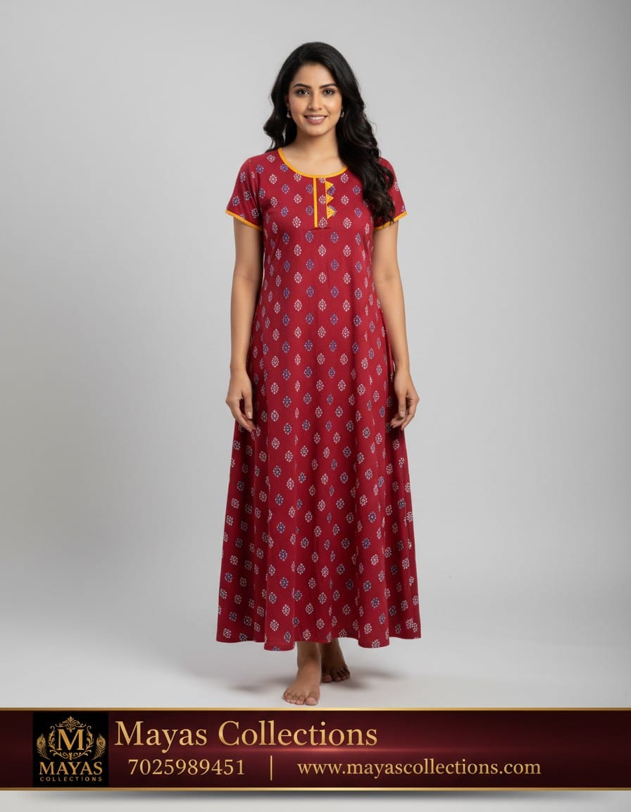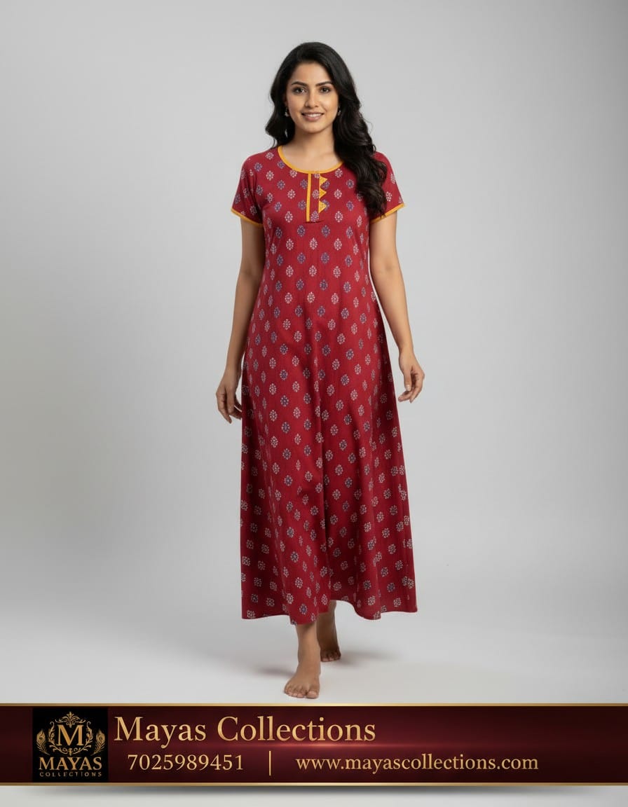 "Mayas" cotton nighties are typically long, loose-fitting maxi-length gowns for women, designed for comfort and ease of movement while sleeping or lounging.